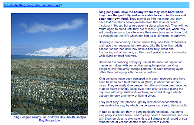 This website is very useful in explaining in simple terms, basic information on the king penguin. Because the information can only be displayed in a double page spread, the information given has to be digestible and understandable. I believe that the way in which tho information is written does this well.